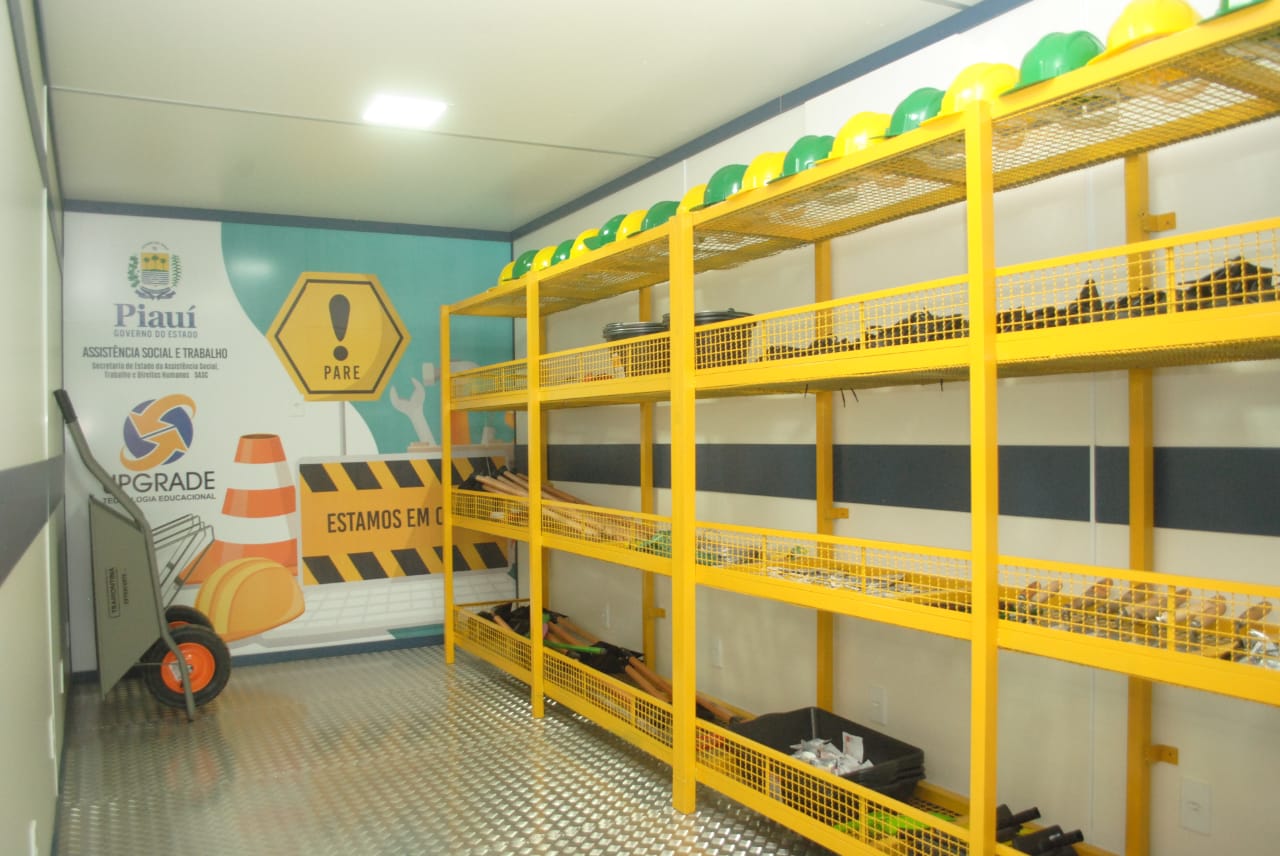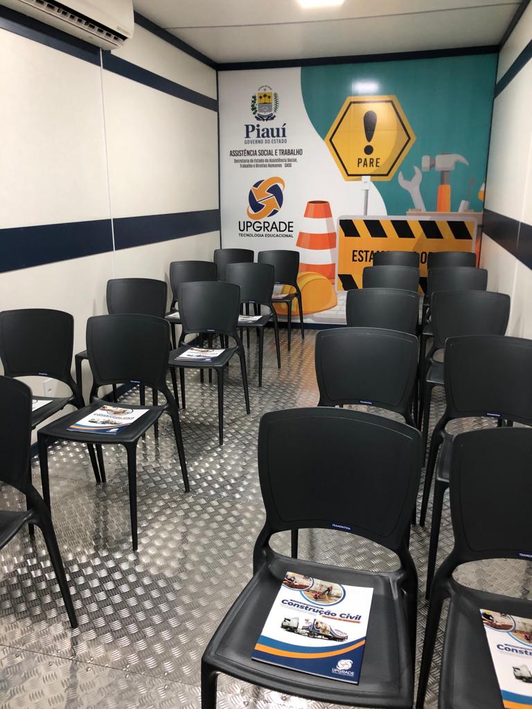 A Unidade Móvel mede 13 metros de comprimento, sendo 6,5 m para Sala de Aula e 6,5 m para o Almoxarife. A estrutura possui 20 carteiras, projetor multimídia, ar condicionado. Nas aulas práticas, faz-se necessário espaço externo.