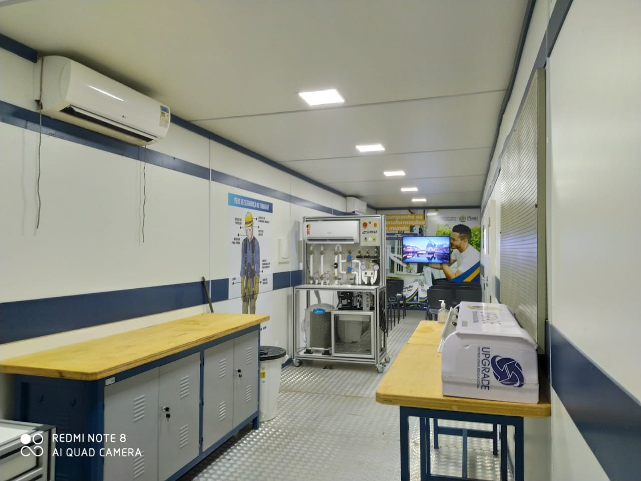 A Unidade Móvel mede 13 metros de comprimento. A estrutura possui 16 cadeiras, bancada de estudos em refrigeração, bancada para montagem e manutenção de aparelho de ar condicionado. Móveis, equipamentos, instrumentos e ar condicionado.